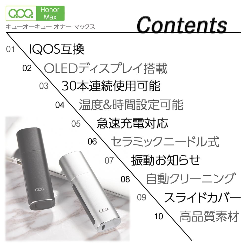 QOQ Honor Max (キューオーキューオナーマックス) 【商品説明】 高品質で当店お客様満足度No 1のQOQ honorのディスプレイ搭載モデルが新登場! 自分好みの加熱温度と喫煙時間の設定が可能となりました。