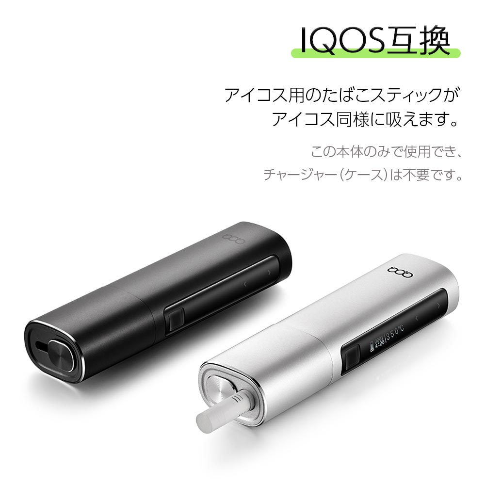 扱いやすく、見やすいディスプレイ搭載で、かんたんな操作ながら加熱温度と喫煙時間の設定が可能となり、 振動通知機能、自動クリーニング機能などを搭載した非常に完成度が高くコストパフォーマンスも抜群のおすすめモデルです! クールでスタイリッシュなデザイン性と大容量バッテリー搭載で豊富な機能を兼ね備えた当店イチオシ商品です! ■iQOS(アイコス)互換 アイコス用のたばこスティックをアイコス同様に吸えます。